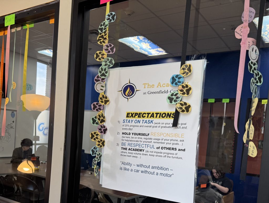 Hanging around the room are colorful ribbons with names of students, adorned with Cougar paw prints representing a credit of coursework completed with the help of The Academy. Some just have one or two paw prints, while others are loaded with nearly a dozen.